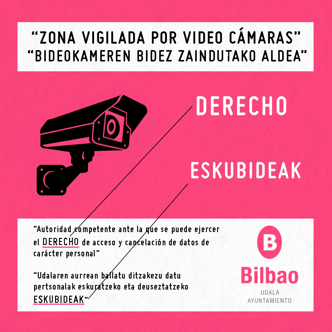 Espazio publikoko bideozaintza-kamerekin lotutako eremuan 3 seinale-mota aurkitu ditugu. Urdinak, non 2 lege organiko mota zerrendatzen diren: 4-1997 LO, Segurtasun Indar eta Kidegoek toki publikoetan bideokameren erabilera arautzen duena, eta 3-2018 LO, blog honen lehen apartatuan aipatua. Bada kolore gorriko beste bat, Bilboko Udalaren logotipoa duena. Bertan aipatzen da datu pertsonalak eskuratzeko edo ezerezteko aukera.